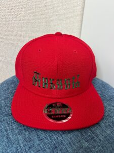ボディ NEWERA NE404 カラー レッド 刺繍テーマ オリジナル文字刺繍 刺繍色 グリーン こだわりポイント 文字をあえて重ねて刺繍